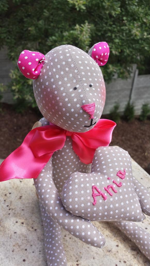 Beżowy w jasne kropeczki z dodatkami w kolorze fuksji. W łapkach trzyma serduszko z ręcznie wyszytym imieniem.
